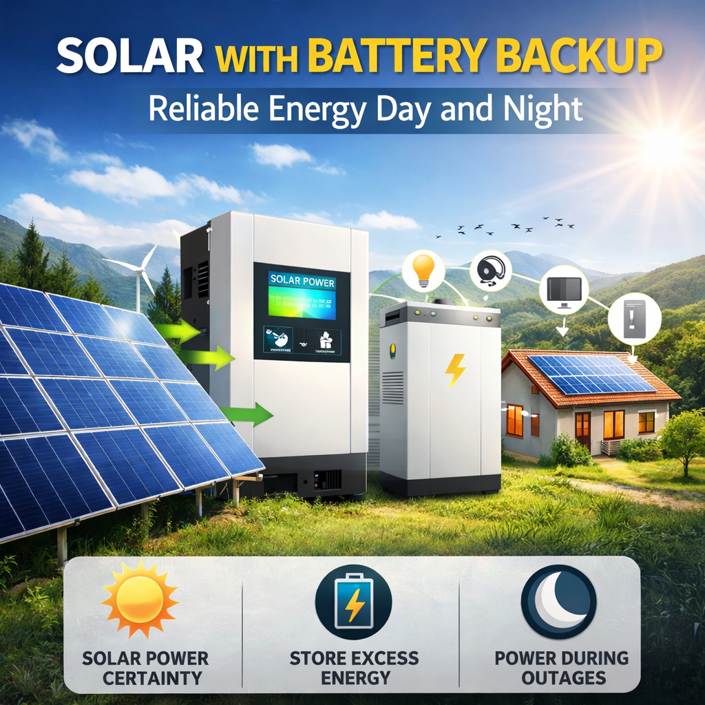 Complete home solar system including panels, inverter and battery backup for uninterrupted power.